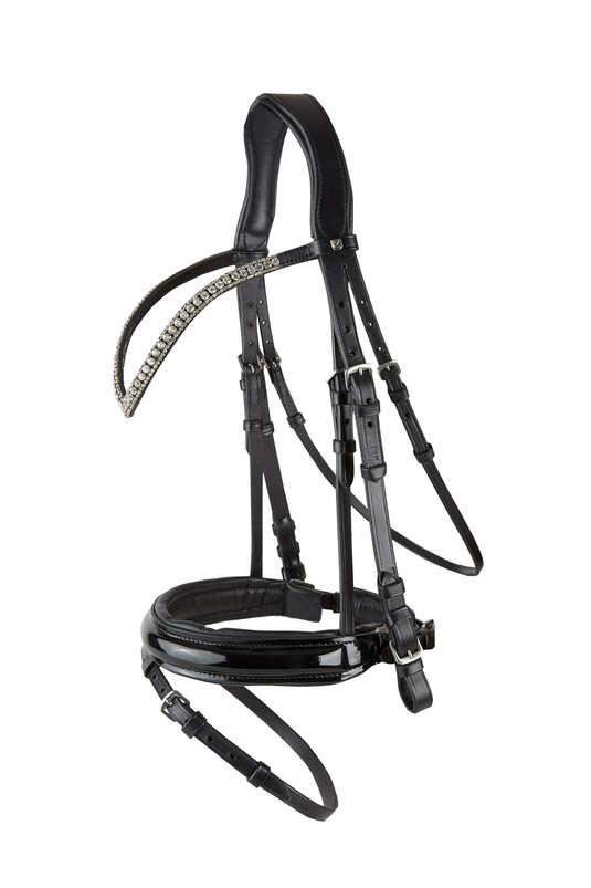 Klasyczne ogłowie ujeżdżeniowe z podszyciem nie tylko pięknie wygląda, ale także charakteryzuje się doskonałym dopasowaniem. Miękkie podszycie w połączeniu z anatomicznym kształtem paska potylicznego to gwarancja komfortu i dokładnego dopasowania. Podszyty nachrapnik można z łatwością wyregulować i zapiąć. Piękny naczółek w kształcie litery V został wykończony błyszczącymi cyrkoniami, które dodają całości szyku.
