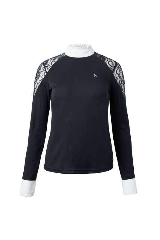 Koszula konkursowa Horze Sylvie ma piękne koronkowe wykończenie i logo z kryształków na piersi.