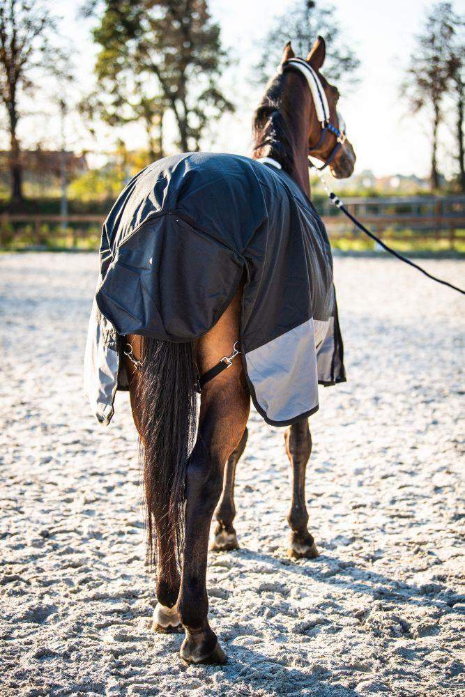 Podwójne zapięcie oraz stabilna regulacja za pomocą podwójnych pasków na klatce piersiowej umożliwiają szybkie i łatwe zakładanie derki, jednocześnie gwarantując jej pewne utrzymanie na miejscu. Dodatkowo, derka posiada pasy krzyżowe, które zapobiegają zsuwaniu się derki podczas aktywności konia.