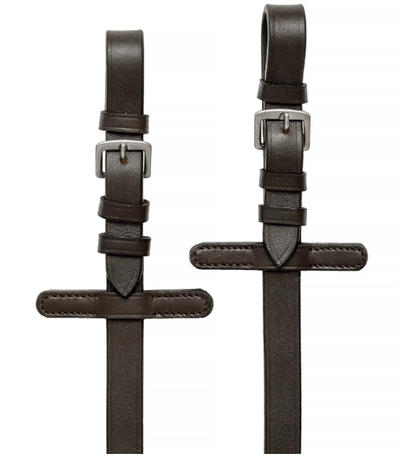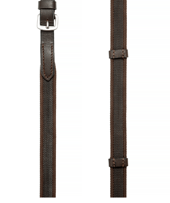 Wytrzymałe gumowe wodze z zapewniającym stabilny chwyt wzorem antypoślizgowym. Zapinane na klasyczne sprzączki. Posiadają motylki do wytoku. Szerokość: 22 mm.