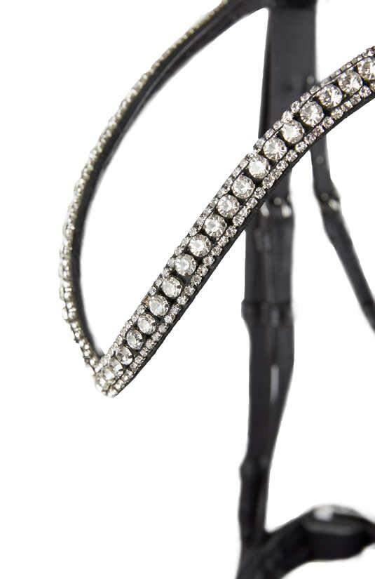 Klasyczne ogłowie ujeżdżeniowe z podszyciem nie tylko pięknie wygląda, ale także charakteryzuje się doskonałym dopasowaniem. Miękkie podszycie w połączeniu z anatomicznym kształtem paska potylicznego to gwarancja komfortu i dokładnego dopasowania. Podszyty nachrapnik można z łatwością wyregulować i zapiąć. Piękny naczółek w kształcie litery V został wykończony błyszczącymi cyrkoniami, które dodają całości szyku.