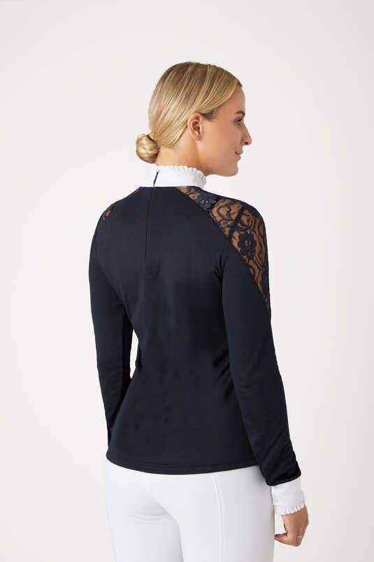 Koszula konkursowa Horze Sylvie ma piękne koronkowe wykończenie i logo z kryształków na piersi.