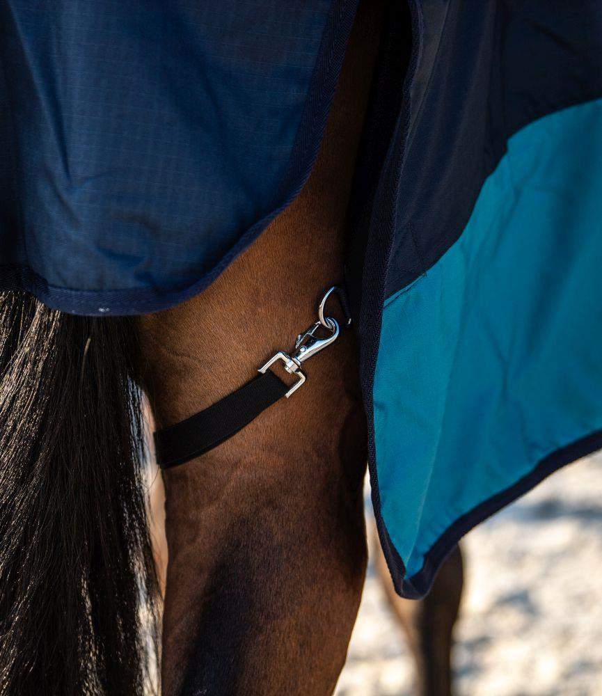 Podwójne zapięcie oraz stabilna regulacja za pomocą podwójnych pasków na klatce piersiowej umożliwiają szybkie i łatwe zakładanie derki, jednocześnie gwarantując jej pewne utrzymanie na miejscu. Dodatkowo, derka posiada pasy krzyżowe, które zapobiegają zsuwaniu się derki podczas aktywności konia.