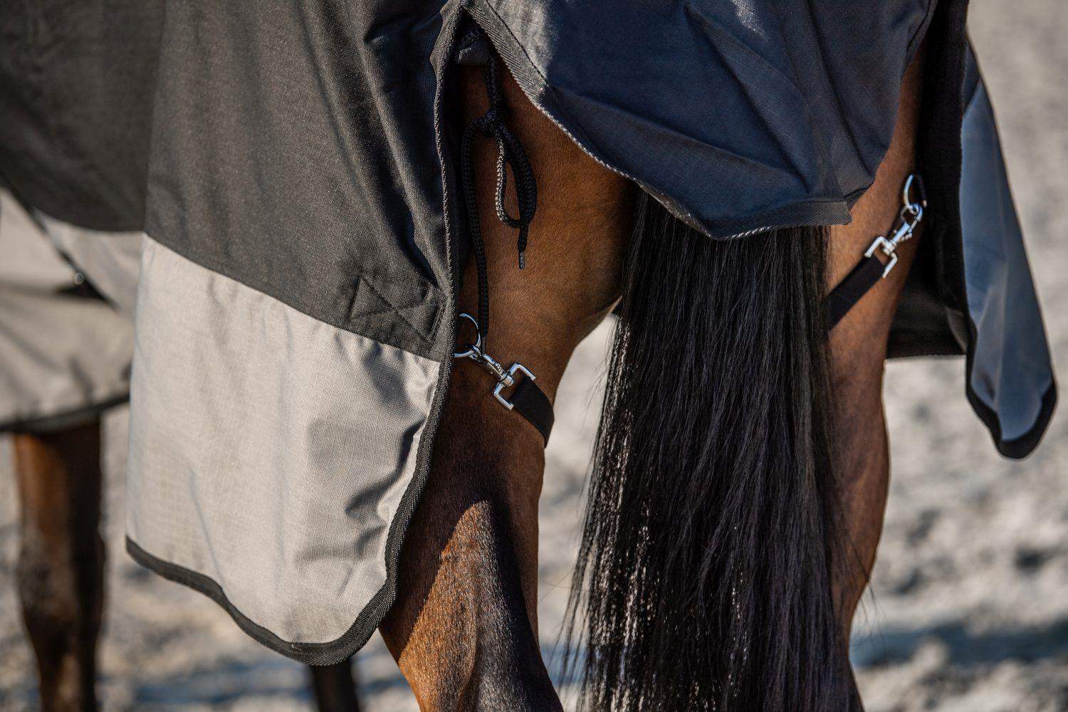 Podwójne zapięcie oraz stabilna regulacja za pomocą podwójnych pasków na klatce piersiowej umożliwiają szybkie i łatwe zakładanie derki, jednocześnie gwarantując jej pewne utrzymanie na miejscu. Dodatkowo, derka posiada pasy krzyżowe, które zapobiegają zsuwaniu się derki podczas aktywności konia.