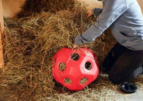 - poprzez zabawę pomaga w powolnym i właściwym dla konia przyjmowaniu surowej karmy