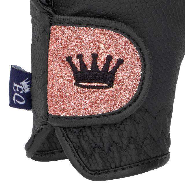 Eleganckie rękawiczki, wykonane z wysokiej jakości skóry syntetycznej. Staranne wykonanie zapewnia estetyczny design i funkcjonalność rękawiczek. Antypoślizgowy materiał umożliwia mocny chwyt wodzy, a wzmocnione szycia w miejscu trzymania wodzy zwiększają wytrzymałość materiału. Zapięcia na mocny rzep i elastyczne ściągacze pomagają w odpowiednim dopasowaniu rękawiczek do dłoni. Zaletą są wstawki na kciuku i palcu wskazującym z materiału umożliwiającego korzystanie z ekranu dotykowego. Rękawiczki posiadają wyrafinowane detale w postaci haftu korony na brokatowym tle. Dostępne są w kilku wariantach kolorystycznych, dzięki czemu łatwiej dopasujesz je do swojej garderoby.